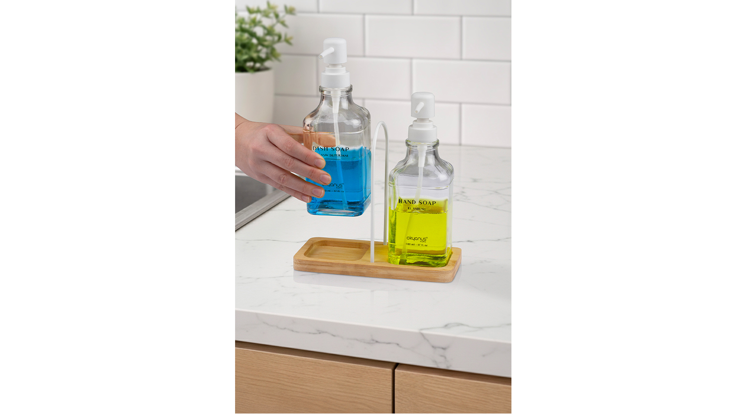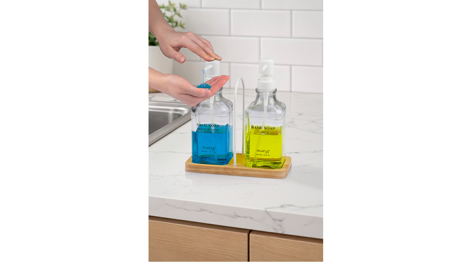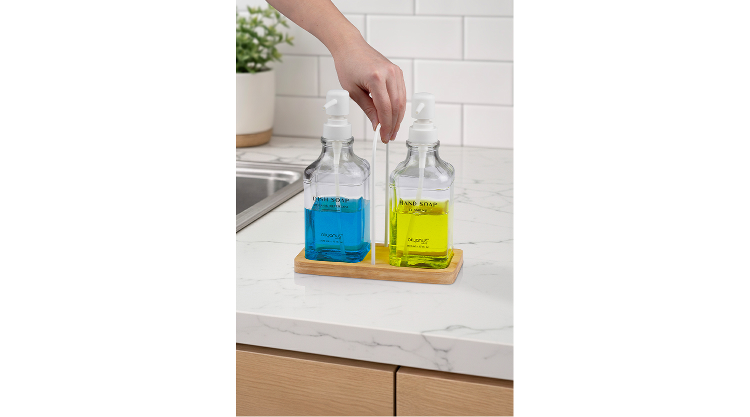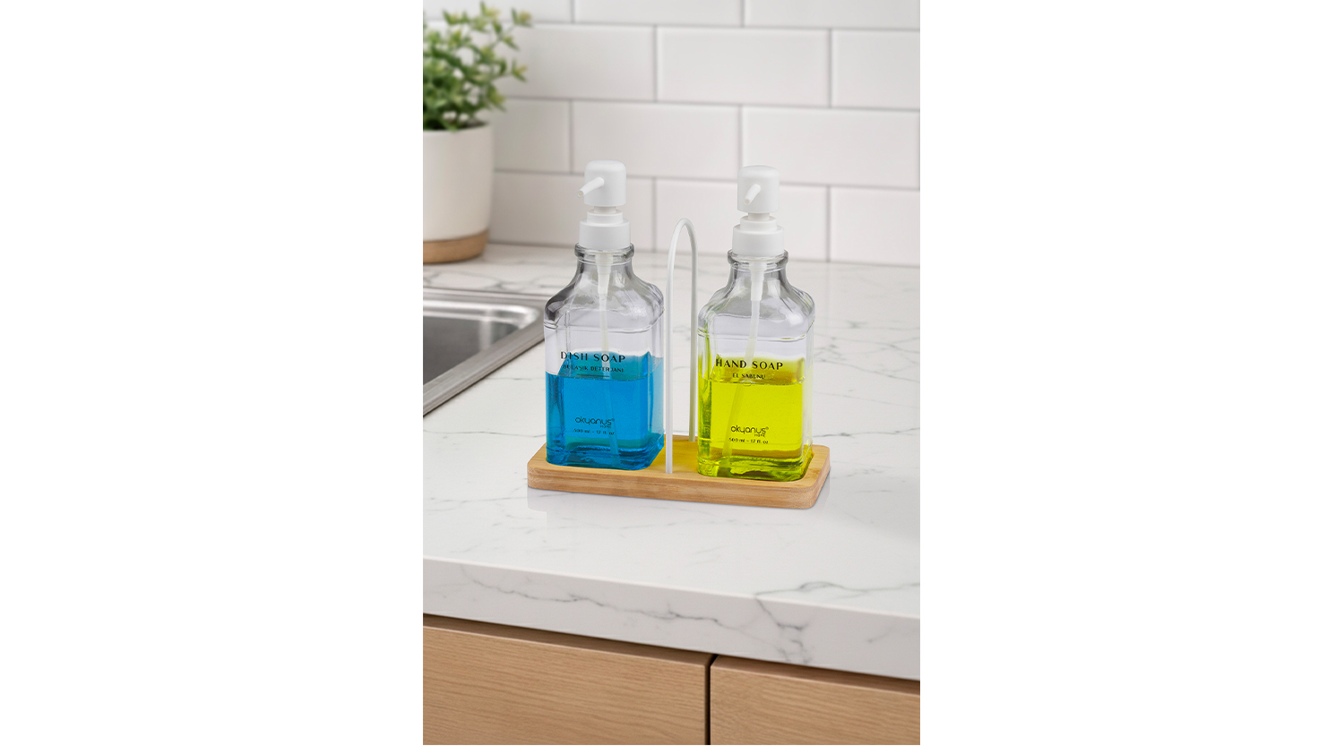 Double Glass Liquid Soap Dispenser with Bamboo Tray