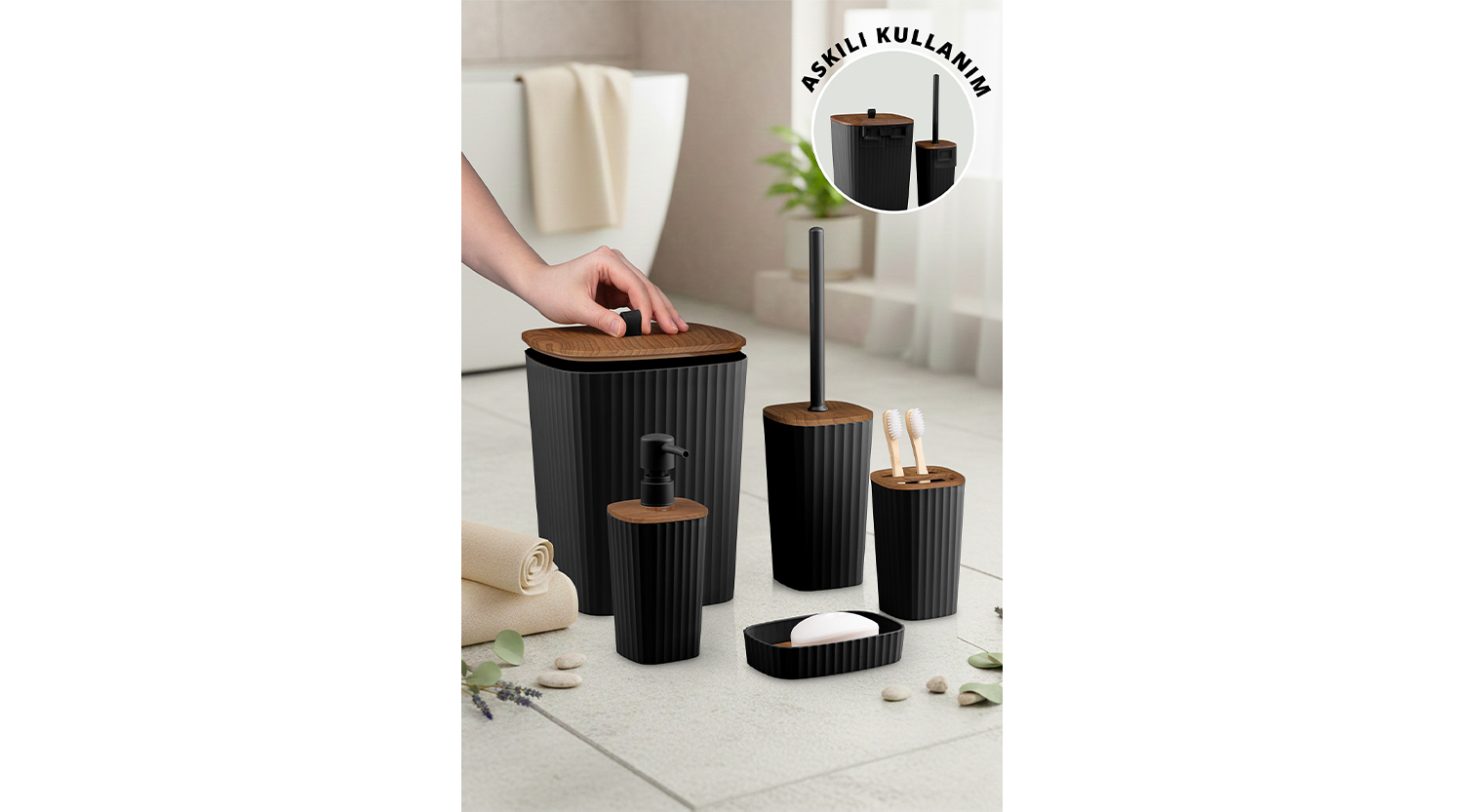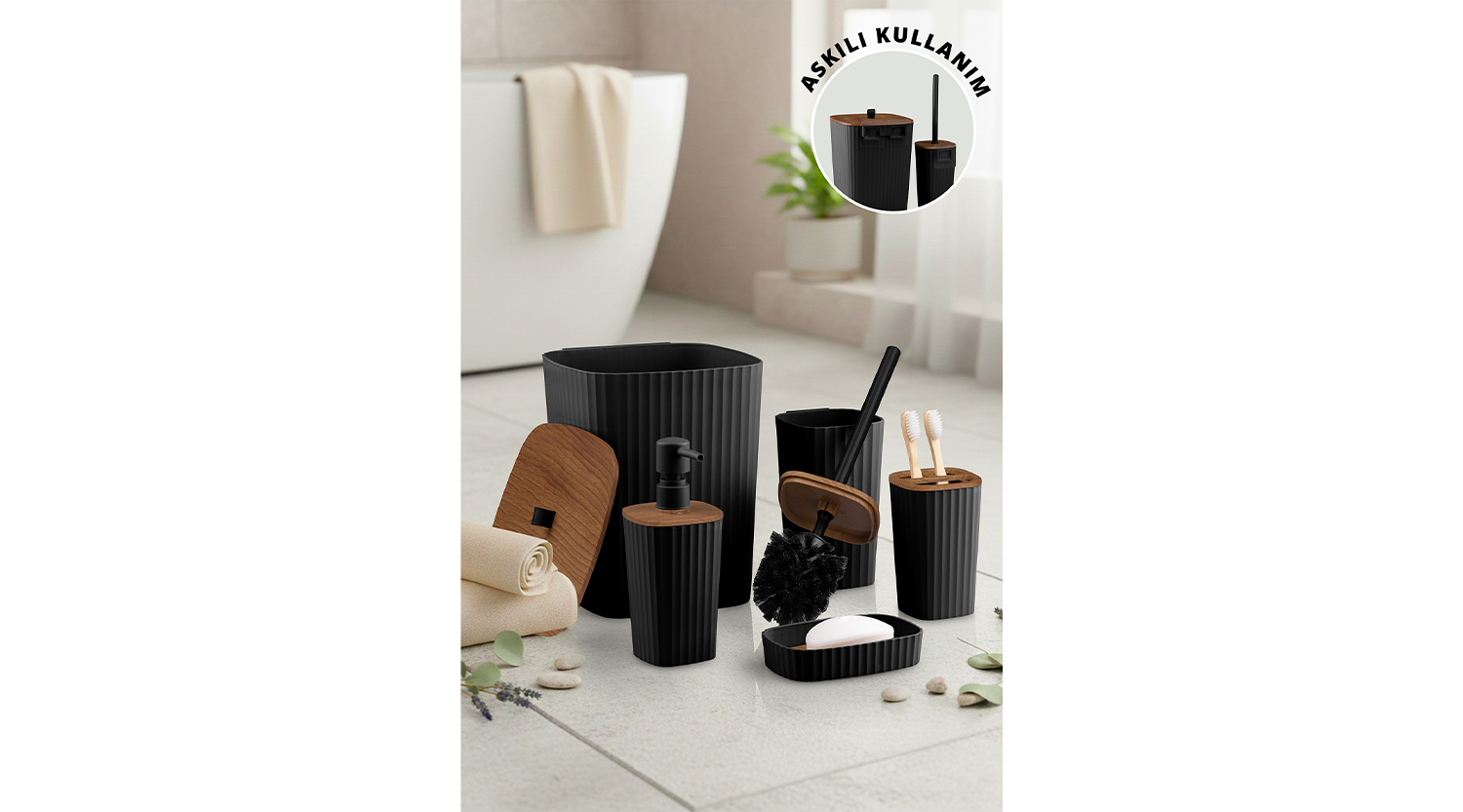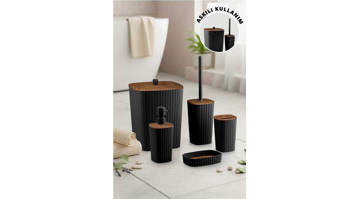Safir Bathroom Set (5 pcs) / Wooden / Black