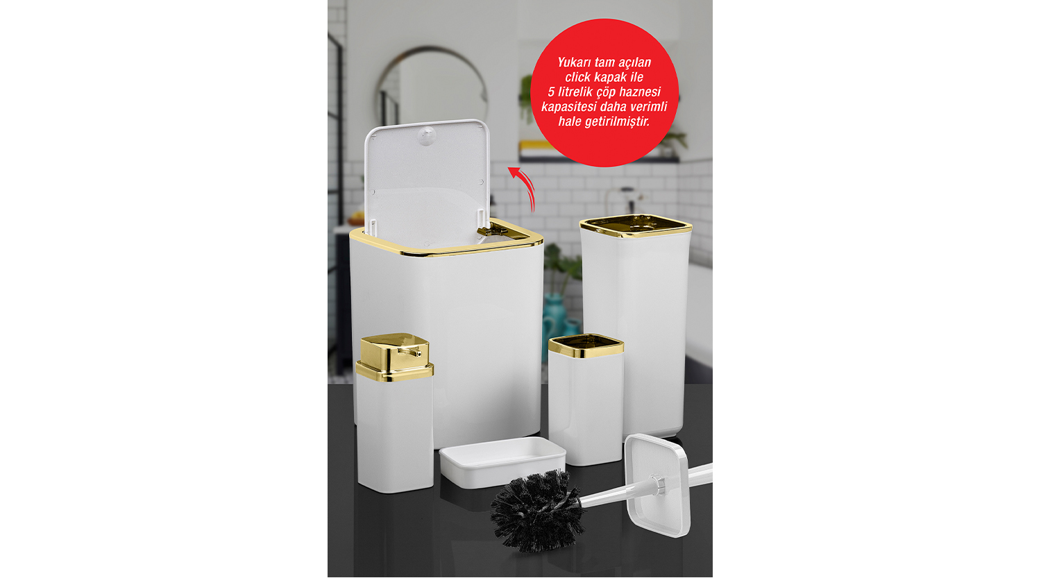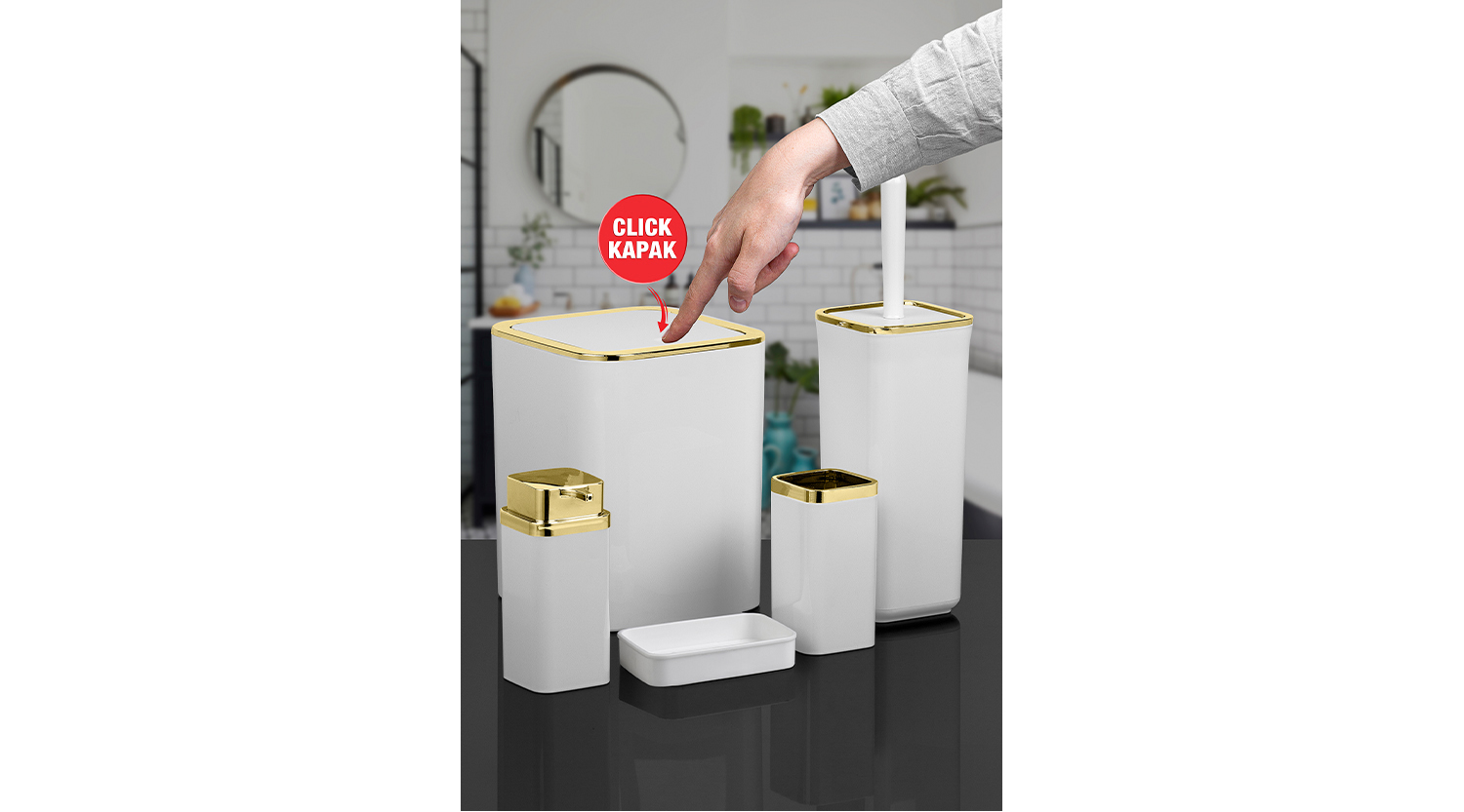 SOAP DISPENSER: 68X68X175 TOOTHBRUSH HOLDER: 68X68X102 SOAP HOLDER: 119X82X26 TOILET BRUSH: 105X105X355 TRASHCAN: 180X180X223