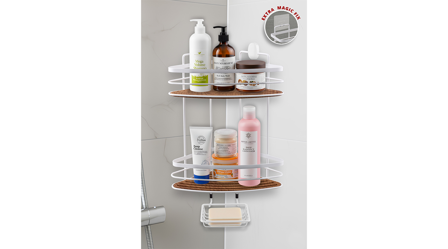 İki Katlı Üçgen Şampuanlık & Sabunluk Beyaz / Ahşap