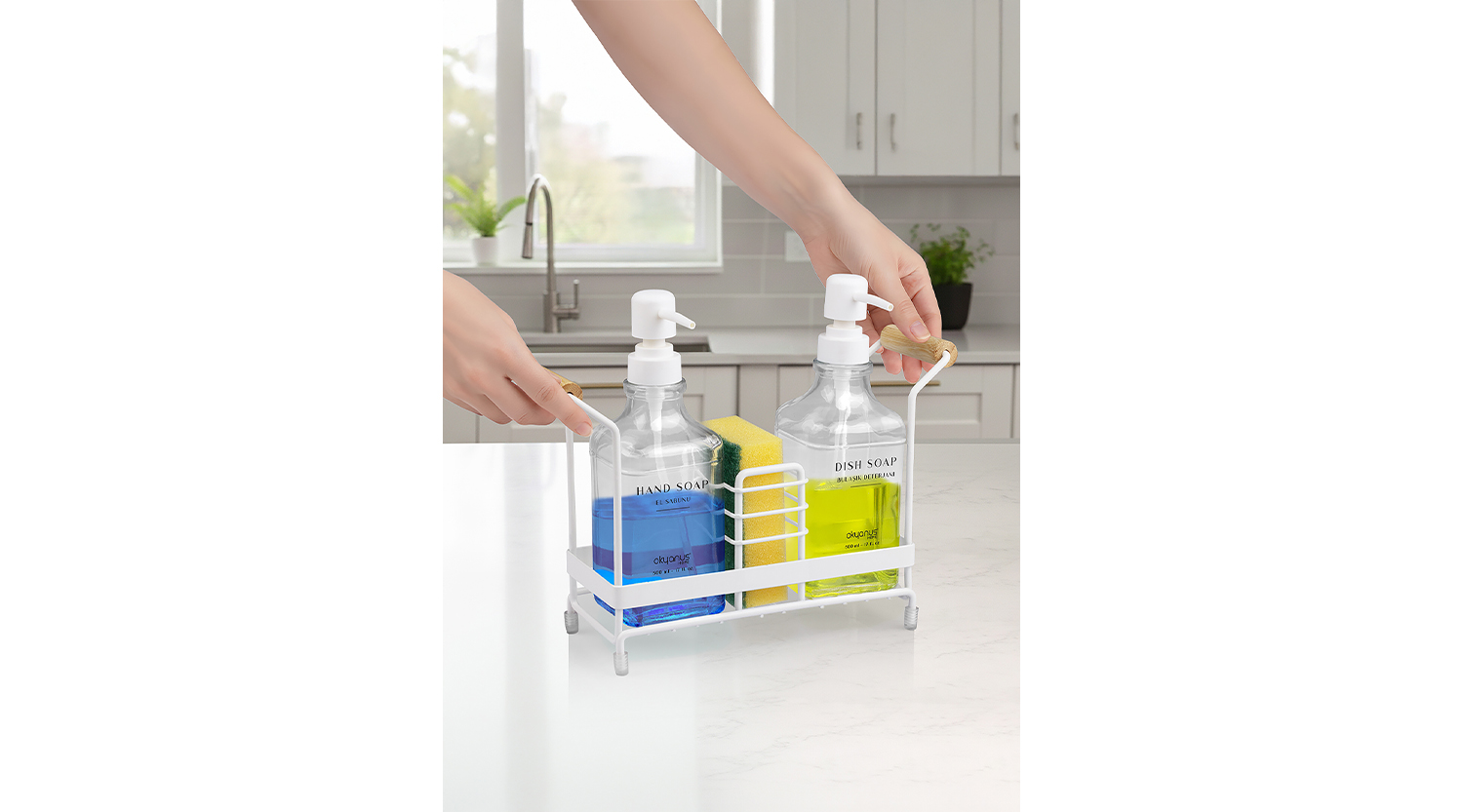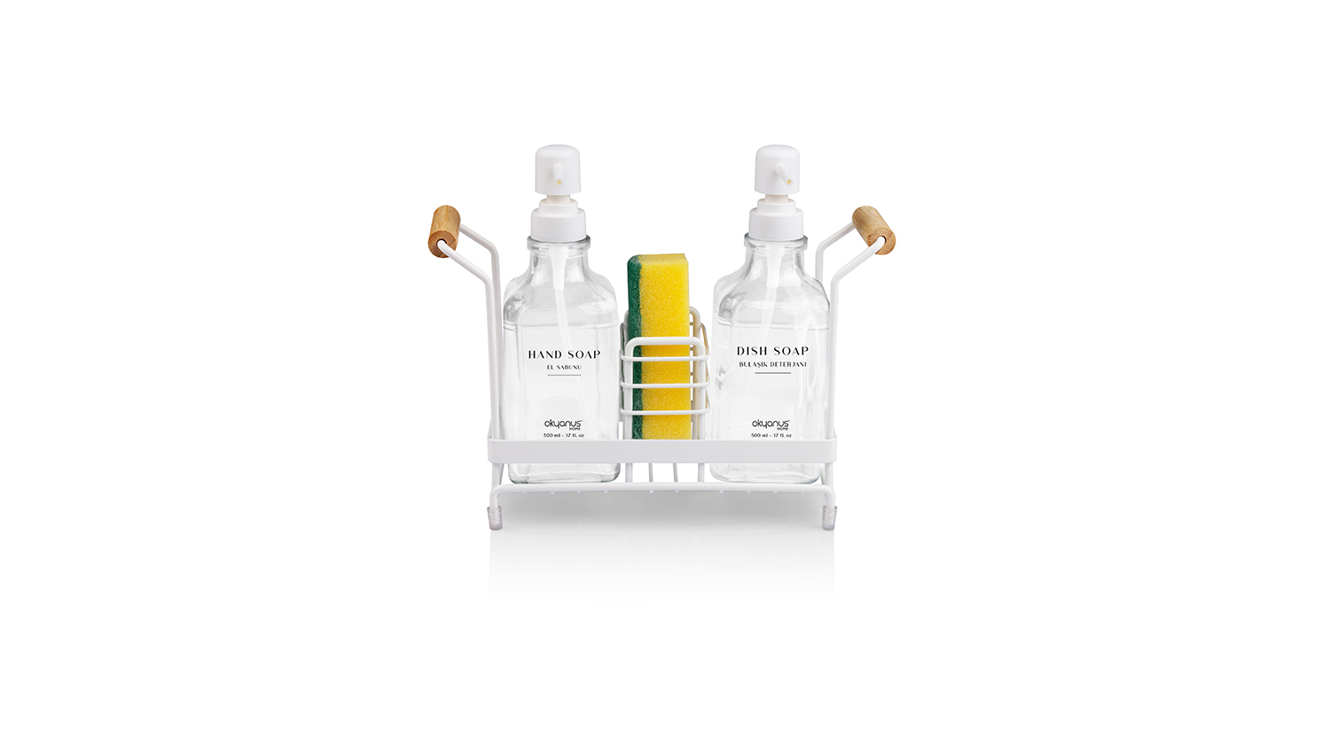 Standlı Kare Cam Sıvı Sabunluk Seti Bambulu / Beyaz