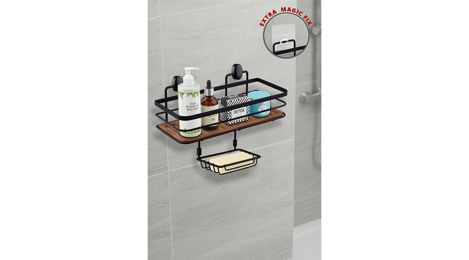 Tek Katlı Dikdörtgen Maxi Şampuanlık & Sabunluk 13 X 30 cm / Siyah / Ahşap